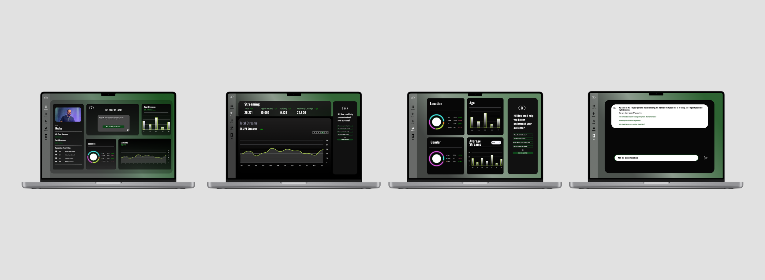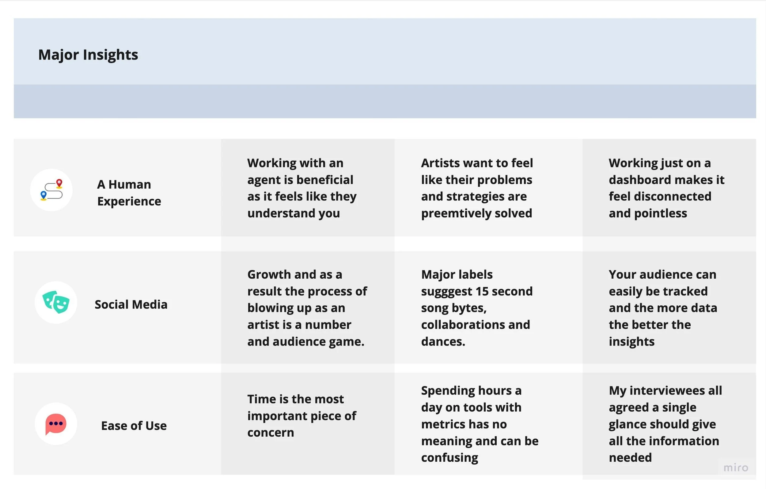 At first, the direction I went to which had been laid out to me by the CEO was in a direction of music streaming analysis and separate AI integration. However, upon doing research with independent artists it became clear that making the experience feel as if you are in conversation or collaborating with the software was crucial. The integration, therefore, had to be with the data and include social media streaming as that seemed to be the main way to get around the attention labels bring.